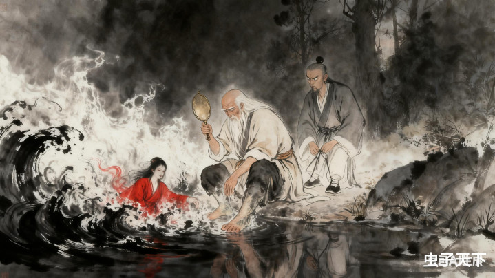 多宝掏出铜镜念咒,潭水简洁,竟然飘出个红衣女鬼。