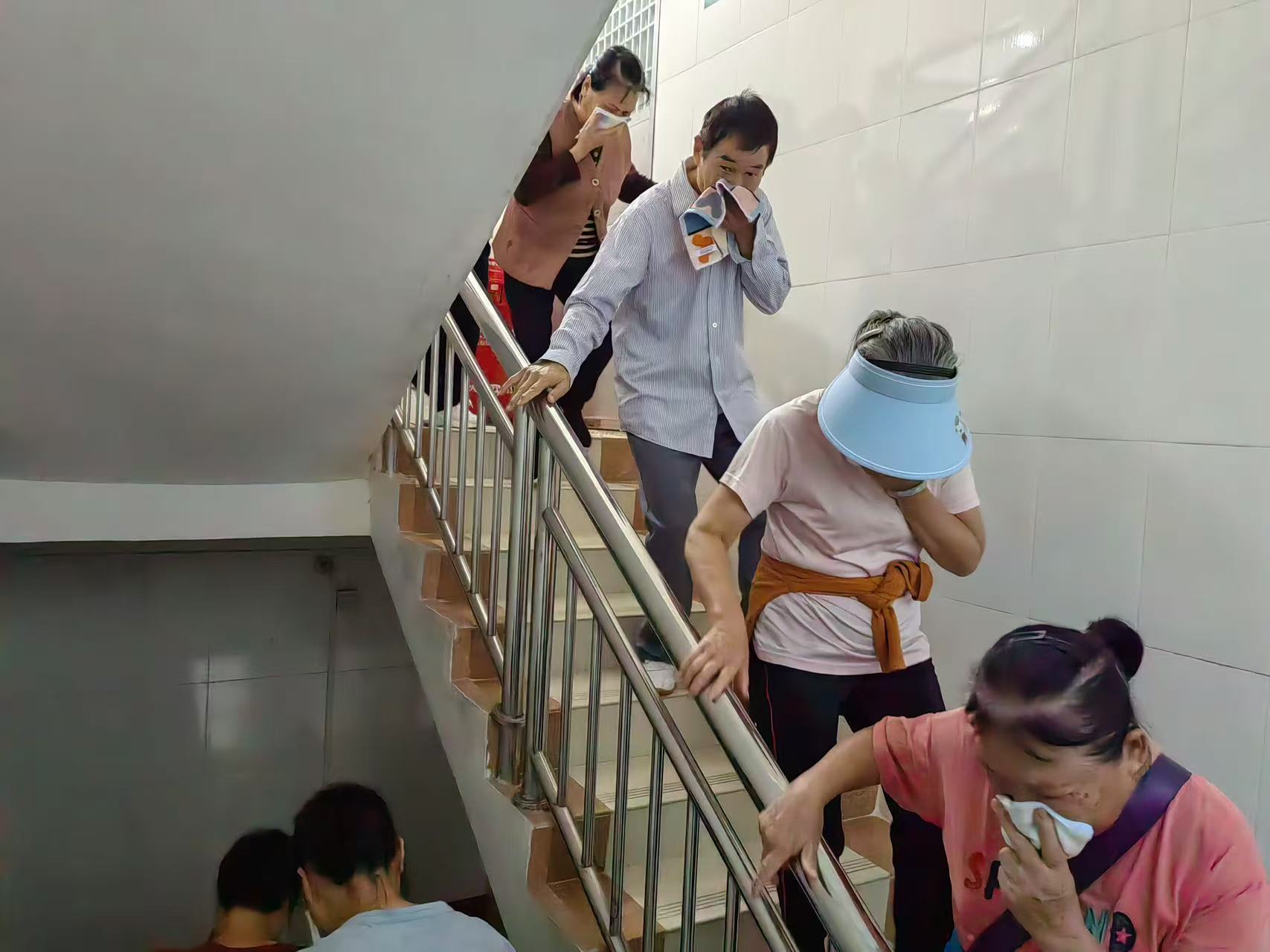 跟着演练提醒下达,演练自建房内马上开释模拟烟雾,模拟电器表示老化短路激发的突发火情。楼栋内住户在责任主说念主员的专科提醒下,马上用湿毛巾捂住口鼻,保持弯腰低姿,沿预定疏散蹊径快速有序震惊。安全抵达指定联结区域后,现场责任主说念主员立即开展东说念主数盘点,证据无东说念主员被困。